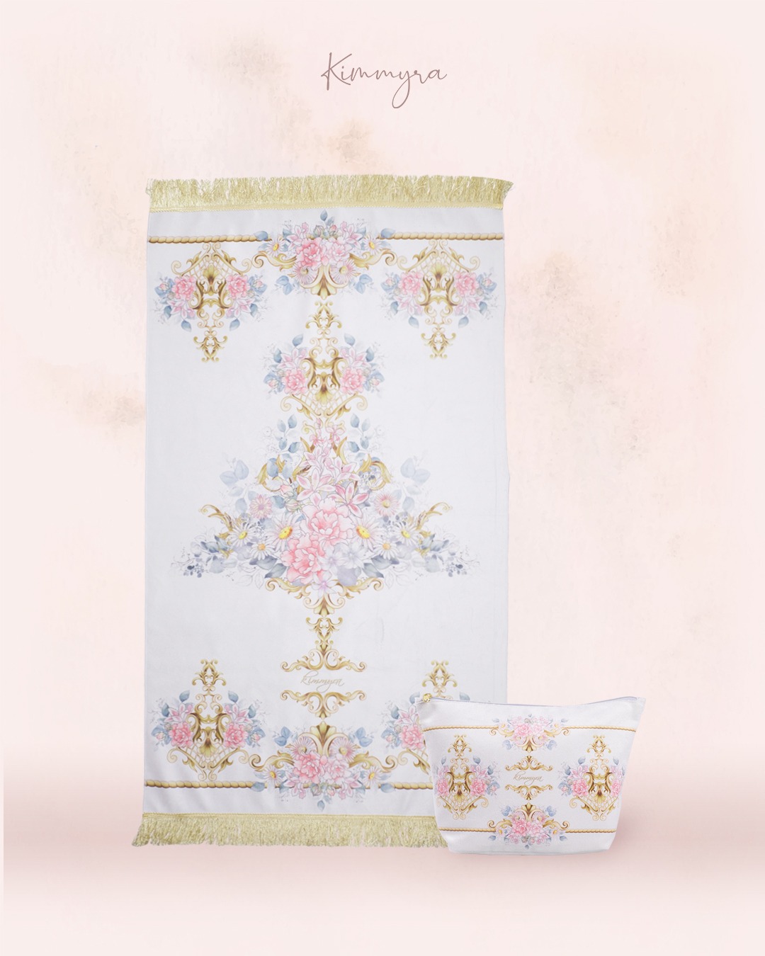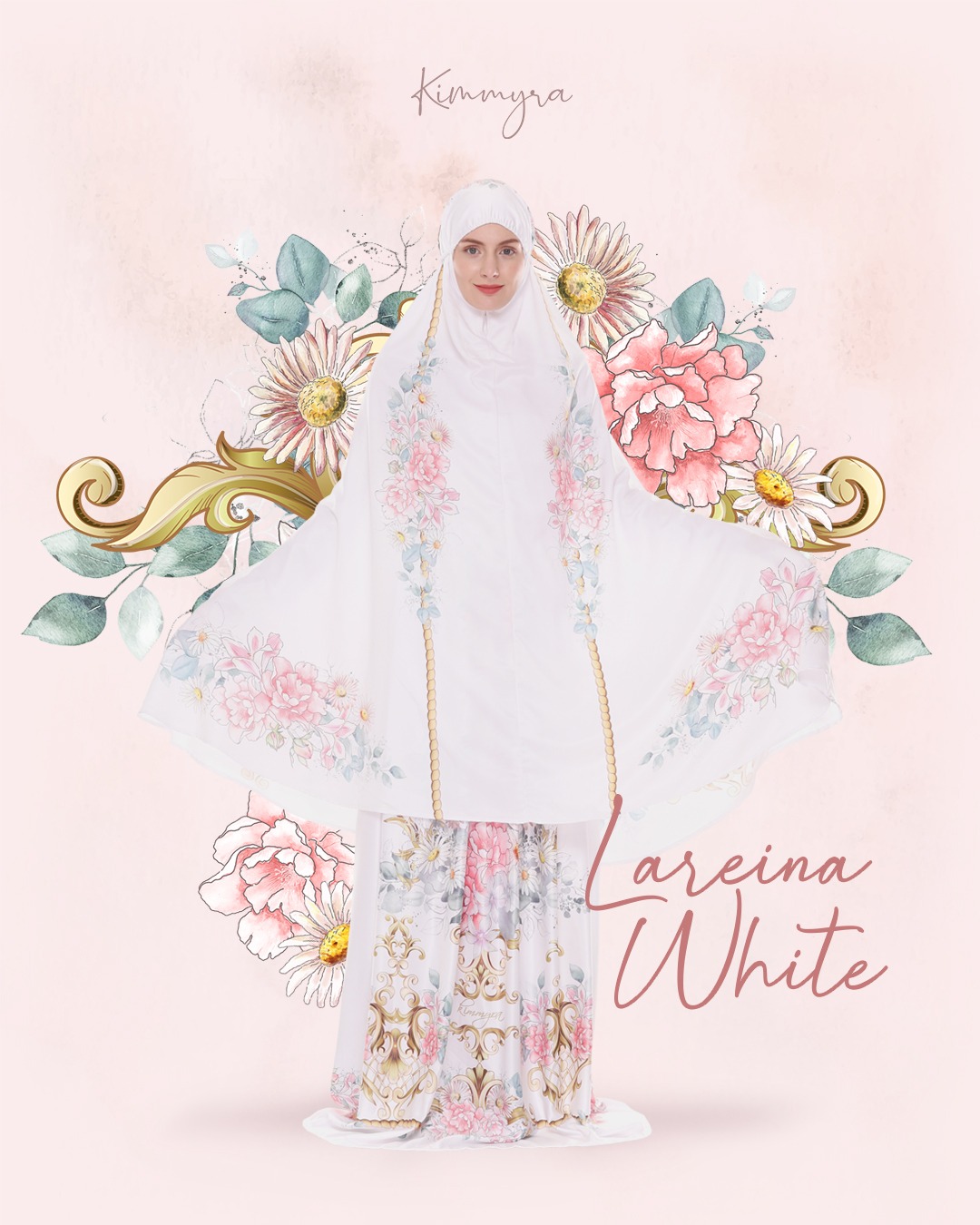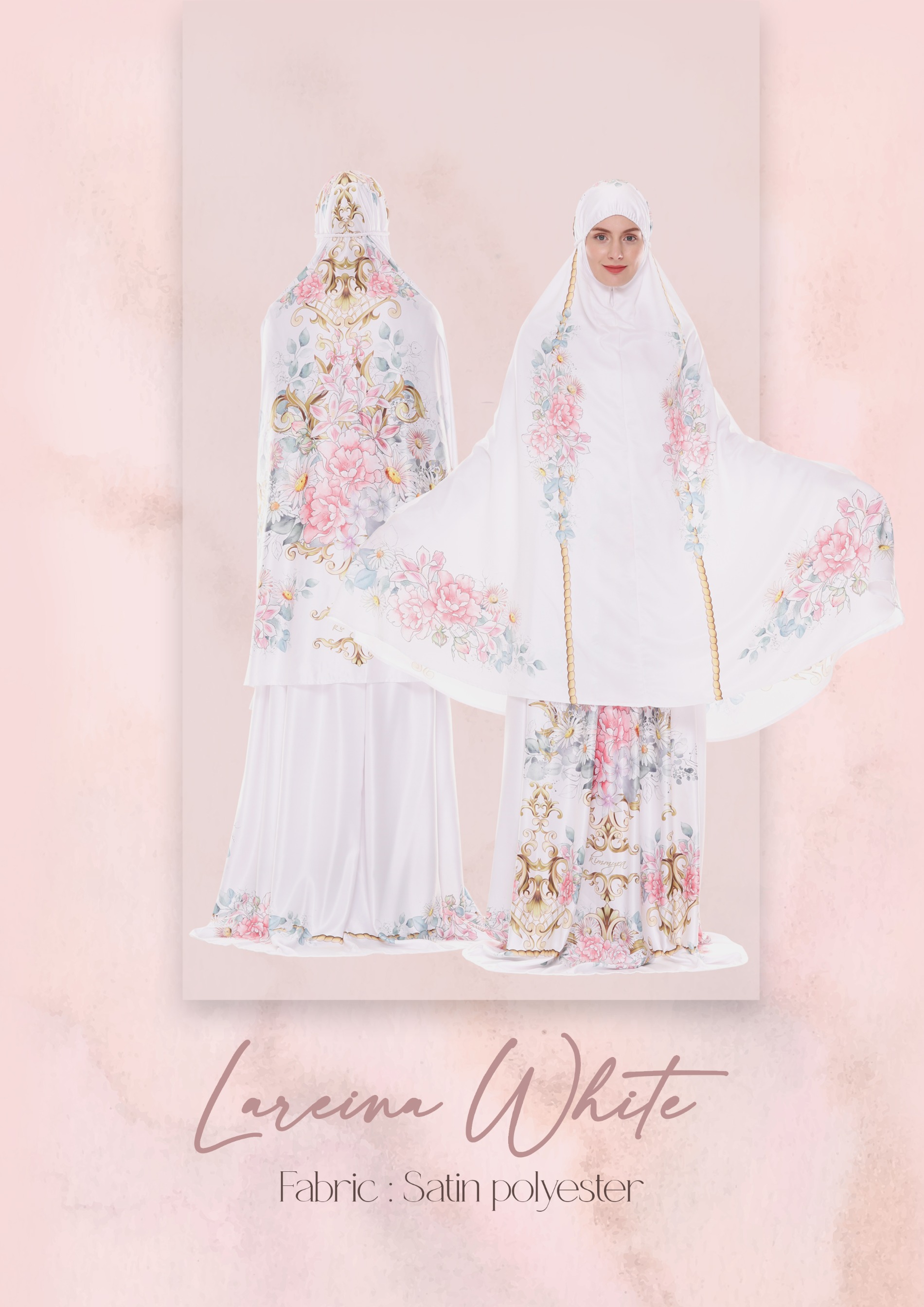 Bisa pesan custom nama (tulis di kolom PESAN saat hendak checkout, jika tidak diisi maka akan tertulis "KIMMYRA" di kolom nama di mukena/sajadah)
