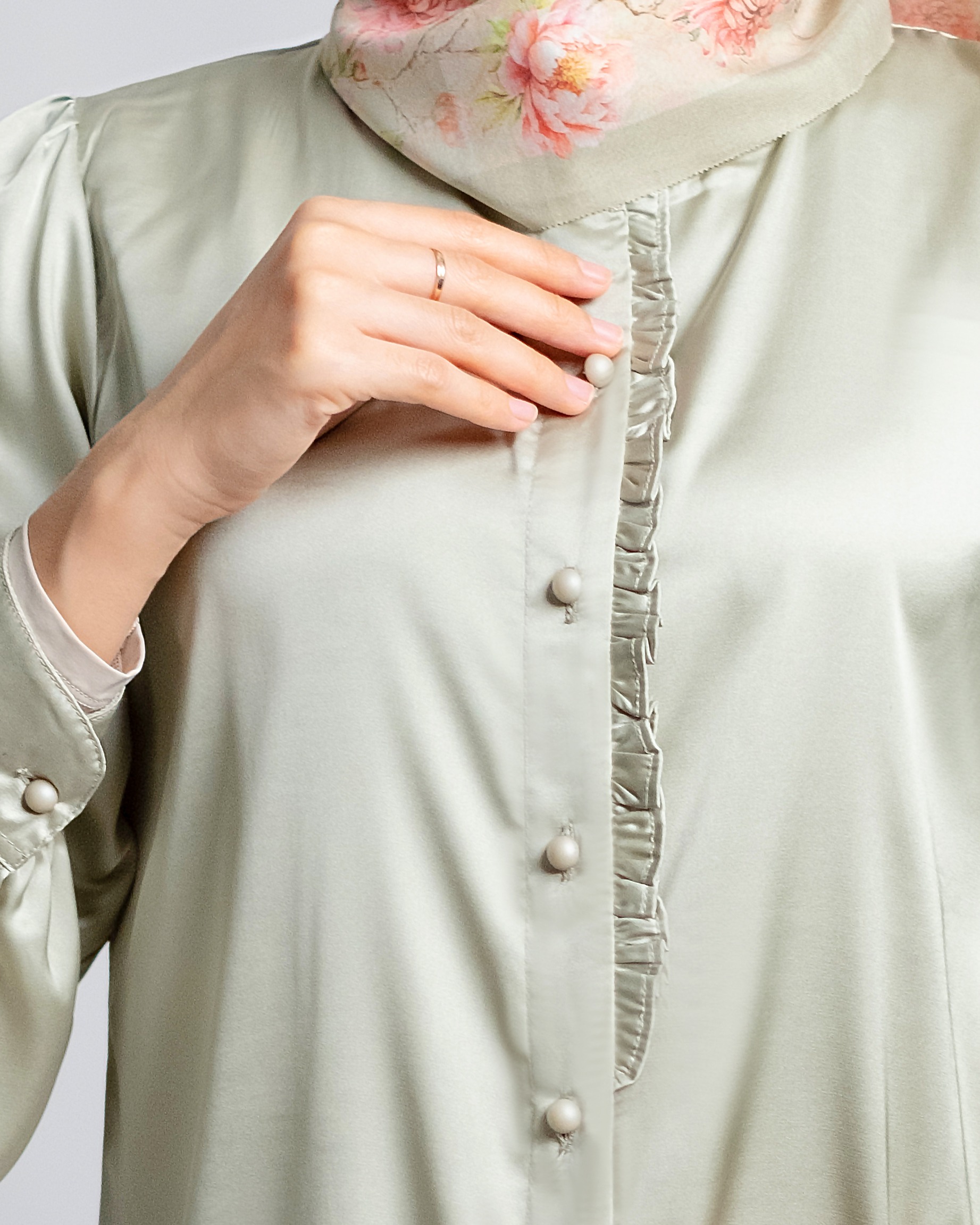 - Aksen frill yang melingkar di kerah hingga ke bagian depan