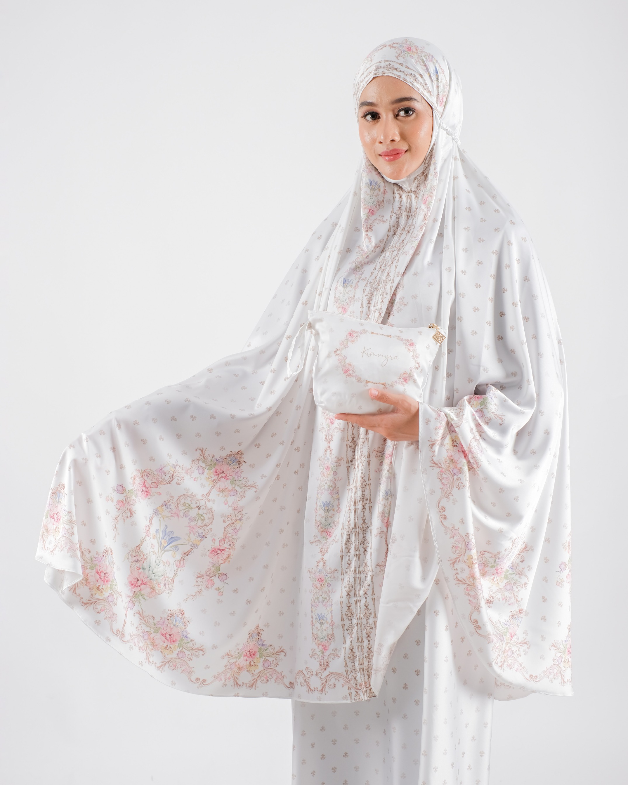 Bisa pesan custom nama (tulis di kolom PESAN saat hendak checkout, jika tidak diisi maka akan tertulis "KIMMYRA" di kolom nama di mukena/sajadah)